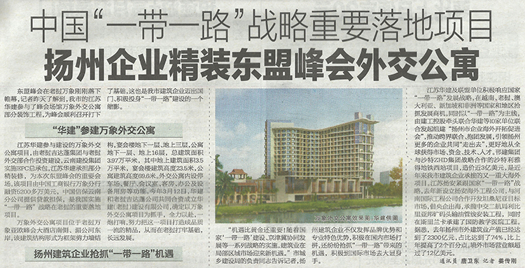 近日,東盟峰會在老撾萬象剛剛落下帷幕。912日,《揚州晚報》A7版刊載題為《中國“一帶一路”戰略重要落地項目  揚州企業精裝東盟峰會外交公寓》的文章,詳細報道華建積極踐行國家“一帶一路”戰略,承建東盟峰會場館萬象外交公寓精裝修工程的有關情況。