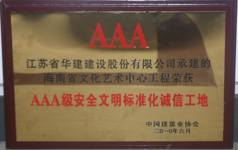 “海南省文化藝術中心”項目榮膺全國AAA級安全文明標準化誠信工地 時間:2010-07-24 5322 近日,經中國建筑業協會建筑安全分會在專家評審、組織抽查和網上公示,海南公司承建的海南省文化藝術中心工程榮膺全國“AAA級安全文明標準化誠信工地”,這是海南公司近年來首次獲得此項榮譽。 該項目自開工以來,以摘取魯班獎為最高質量目標,積極策劃,精心組織,以過程創精品,狠抓細部施工,各項指標始終處于受控狀態,多次接受省、市領導、專家、同行的現場觀摩,獲得業內高度評價。