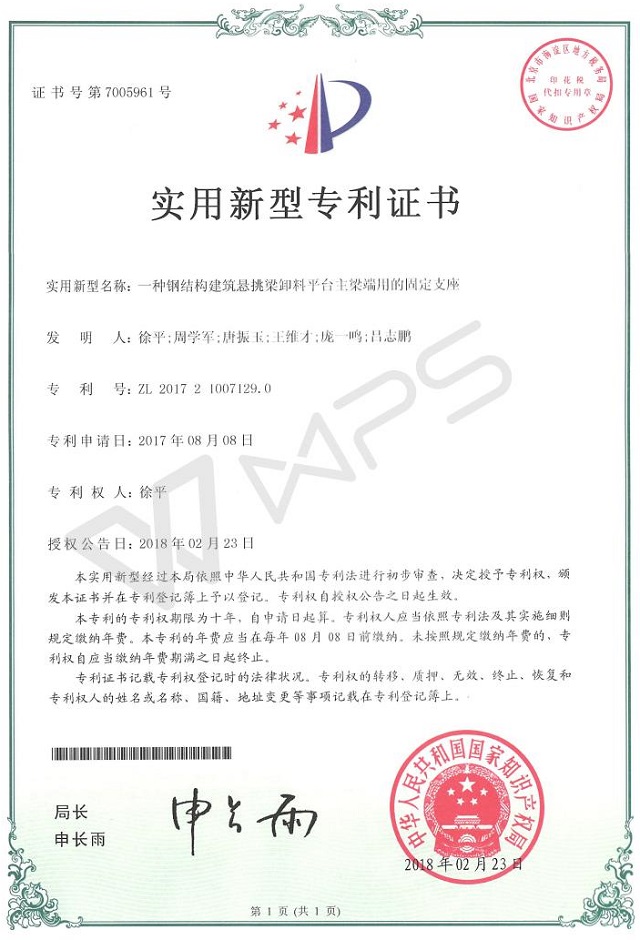 近日,從國家知識產(chǎn)權局傳來喜訊,公司申請的《一種鋼結構建筑懸挑梁卸料平臺主梁端用的固定支座...