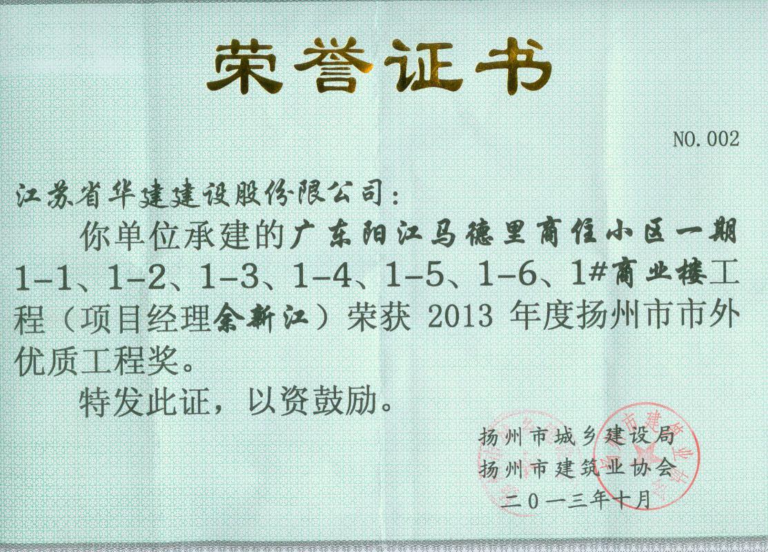 2013年陽江陽光馬德里項目揚州市市外優(yōu)質(zhì)工程獎