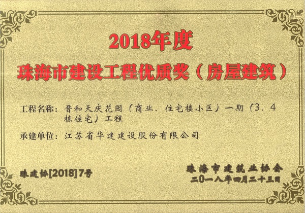 晉合天慶花園一期獲2018年度珠海市建設工程優質獎