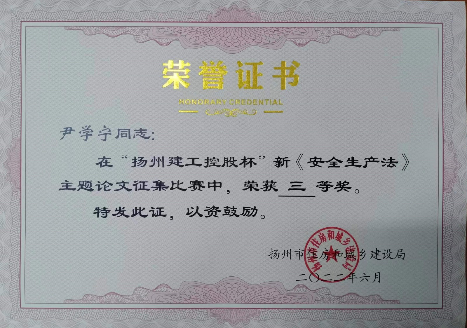 近日,從揚州市住房和城鄉建設局傳來喜訊,由北京公司投稿的4篇論文榮獲“揚州建工控股杯”新《安全生產法》主題論文征文比賽獎項,并獲頒證書,其中一等獎一項,三等獎一項,優秀論文獎兩項。