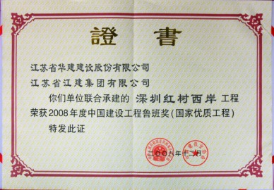 紅樹西岸工程位于深圳填海區,由3棟31層的折線形塔樓組成,建筑高度99.2米,建筑面積33.4萬平方米,3幢高層住宅樓呈“風車”狀組合在大面積水景花園之中,既富現代氣息、又與自然環境和諧共生,是深圳灣畔極具標志性的高尚住宅建筑。工程2003年10月20日開工, 2006年3月28日竣工,獲得2007年度深圳市優質工程、“金牛獎”;2007年度江蘇省省外優質工程“揚子杯”;2007年度廣東省優良樣板工程、“金匠獎”;2005年度深圳市優質結構工程獎;2005年度深圳市新技術應用示范工程第一名;2005年度江蘇省新技術應用示范工程;2006年11月通過建設部第五批全國建筑業新技術應用示范工程驗收,“整體應用水平達到國內領先”;“控制隔音樓地面施工質量”QC成果于2006年4月在江蘇省發布并榮獲成果一等獎,該項QC成果于2006年7月參加中建協組織的全國工程建設優秀QC成果交流,小組榮獲2006年全國工程建設優秀質量管理小組稱號;2008年11月榮獲魯班獎。