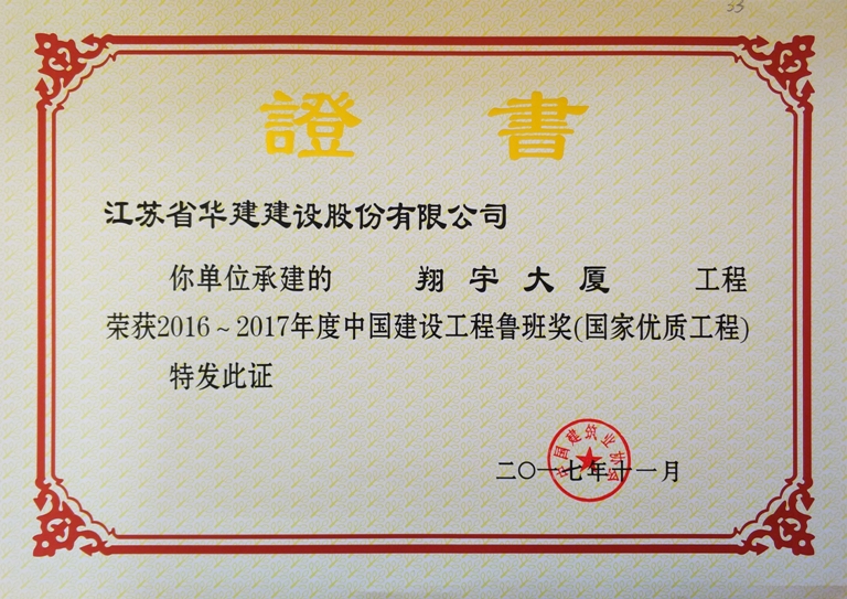 翔宇大廈工程位于淮安市生態新城核心示范區,北鄰景會路、西鄰致遠路、南面為篆香樓路,交通便利地,由淮安新城房地產開發有限公司投資,東南大學建筑設計研究院設計,江蘇省華建建設股份有限公司總承包施工,總建筑面積90300平方米,其中地上72036平方米,地下18264平方米。工程由南北主樓、中裙樓和北裙樓組成,南主樓20層,北主樓22層,建筑高度88.6米,主體結構為鋼筋混凝土框架剪力墻結構,基礎為樁+筏板基礎。該工程于2011年7月18日破土動工,于2014年9月9日竣工。該工程被評為住建部綠色施工科技示范工程、國家AAA級安全文明標準化工地和江蘇省建筑業新技術應用示范工程。2016年被中建協評為2016—2017年度中國建設工程魯班獎(國家優質工程)。