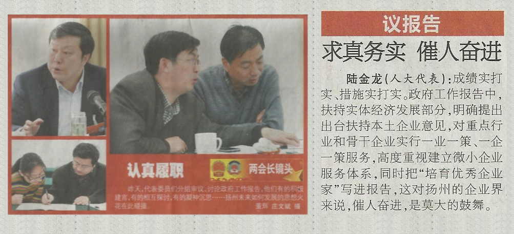 元月7日的《揚州日報》焦點新聞欄目報道了我公司董事長陸金龍參加揚州市七屆人大二次會議的有關(guān)情況。本次人代會6日上午在揚州會議中心隆重開幕,作為市人大代表,陸董事長在會上認真參與對朱民陽市長代表政府所作工作報告的討論,并圍繞“六個基本”抓發(fā)展、合力推進“三個揚州”和世界名城建設(shè)、加快建設(shè)更高水平小康社會積極建言獻策。《揚州日報》在人大代表“議報告”中第一個刊登了陸董事長的發(fā)言:“成績實打?qū)崱⒋胧嵈驅(qū)崱Uぷ鲌蟾嬷校龀謱嶓w經(jīng)濟發(fā)展部分,明確提出出臺扶持本土企業(yè)意見,對重點行業(yè)和骨干企業(yè)實行一業(yè)一策、一企一策服務(wù),高度重視建立微小企業(yè)服務(wù)體系,同時把‘培育優(yōu)秀企業(yè)家’寫進報告,這對揚州的企業(yè)界來說,催人奮進,是莫大的鼓舞。”
