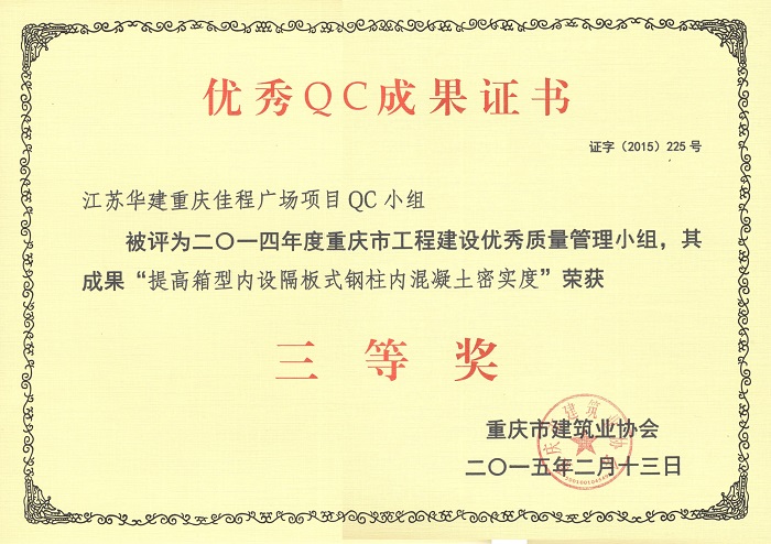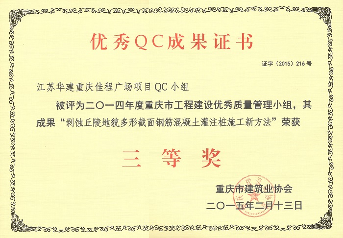近日,重慶市建筑業協會發文表彰了一批優秀QC成果,公司重慶佳程廣場項目QC小組被評為2014年度重慶市工程建設優秀質量管理小組,其成果“提高箱型內設隔板式鋼柱內混凝土密實度”、“剝蝕丘陵地貌多形截面鋼筋混凝土灌注樁施工新方法”、“重慶佳程廣場基礎工程大體積混凝土裂縫成因分析和預控”等均榮獲三等獎。