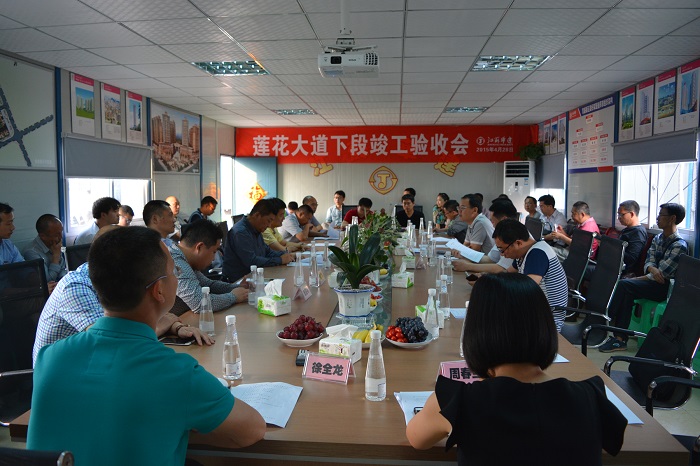 428下午,廣安項目蓮花大道下段竣工驗收會在項目現場會議室舉行。廣安區副區長侯仁祿、區委常委李榮盛,江蘇華建珠海區域公司總經理繆國樞等出席驗收會。