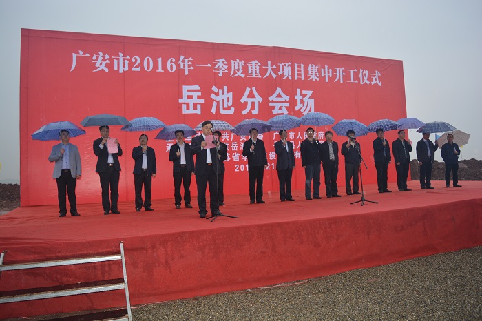 3月21日上午,廣安市2016年一季度重大項目集中開工儀式岳池分會場在岳池城東新區隆重舉行以公司岳池城東新區基礎設施、智慧城市及海綿城市建設PPP項目為代表的一批項目正式開工建設。廣安市委常委、組織部長黃秀川、副市長席世洪,岳池縣委副書記、縣長湯才勇等領導,廣安市住建、交通、水務等部局負責人,岳池縣人大、政協及縣住建、發改等多個部局負責人出席活動。岳池縣委常委、常務副縣長鐘愛平主持儀式。