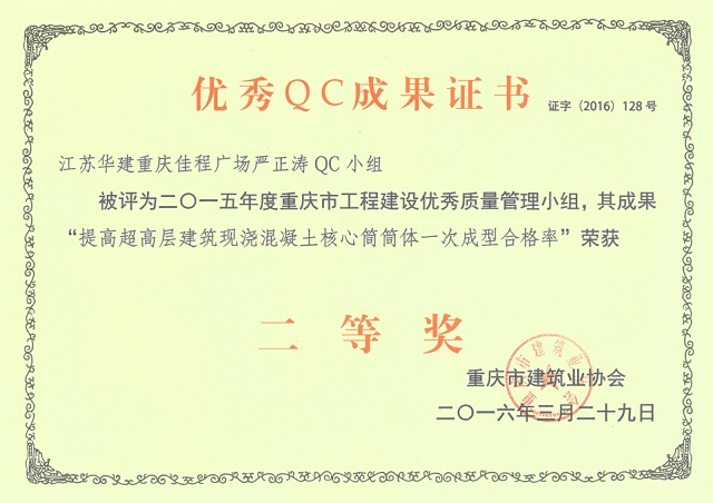 近日,重慶市建筑業(yè)協(xié)會發(fā)文表彰了一批優(yōu)秀QC成果,公司重慶佳程廣場項目嚴正濤、沈正祥QC小組被評為2015年度重慶市工程建設優(yōu)秀質(zhì)量管理小組,其成果“提高超高層建筑現(xiàn)澆混凝土核心筒筒體一次成型合格率”、“提高鋼筋機械套筒連接合格率”等均榮獲等獎。