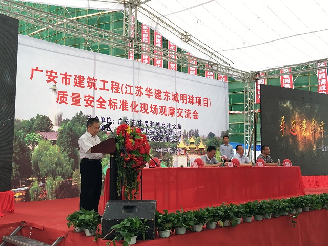 岳池縣副縣長楊偉首先致辭,對觀摩會的順利召開表示祝賀。公司常務副總經理程杰作為施工單位代表,簡要介紹了東城明珠項目概況,并從工程質量安全管理、綠色環保理念、標準化建設等方面對項目管理經驗作了交流分享。廣安市住建局總工程師劉運舉作總結發言,他對江蘇華建積極投資廣安城市建設表示感謝,指出江蘇華建連續三年承辦廣安市建筑工程質量安全標準化施工現場觀摩會,為廣安建筑企業樹立了學習的榜樣和標桿,并從擴大質安監管覆蓋面,構建“網格化”監管體系,實現檢查方式檢查內容差別化管理工作重心“四個轉變”等方面對全市建筑工程質量安全工作提出具體要求。