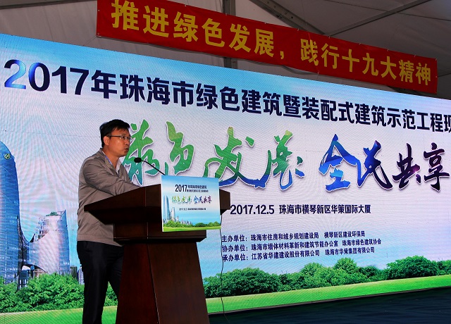 “2017年珠海市綠色建筑暨裝配式建筑示范工程現場會” 12月5日在我司承建的橫琴新區華策國際大廈項目現場成功舉行珠海市住房和城鄉規劃建設局組織召開本次現場會。會議以“推進綠色發展,踐行十九大精神”為主題,以加快建設生態環保城市,深入開展創建全省綠色建筑和裝配式建筑示范工程宣貫活動,扎實推進珠海市綠色建筑和裝配式建筑的發展,利用標桿示范的力量激勵建筑企業創精品工程,促進綠色生態建筑建設管理水平躍升為目的。珠海市住房和城鄉規劃建設局總工程師毛建華、橫琴新區建設環保局副局長溫衛軍、珠海市墻體材料革新和建筑節能辦公室主任徐志明、副主任陳朝暉、我公司副總經理兼總工程師周學軍出席了本次會議。市住規建局領導及相關科室工作人員、各區(經濟功能區)建設行政主管部門分管領導及相關科室工作人員、市(區)節能辦、質檢站負責人及中層管理人員、全市主要建筑規劃、設計單位、房地產開發企業、審圖機構、建筑施工企業、建筑監理企業代表及媒體記者等近200人參加了此次現場觀摩會。