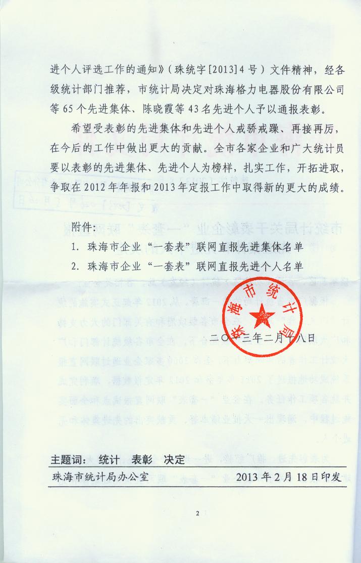 2013年珠海市統(tǒng)計局一套表聯(lián)網(wǎng)直報工作先進單位